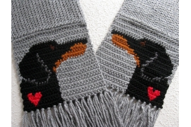 The scarf is loom knitted (double thickness) and then I crochet the mountain dogs into the ends of the scarf. The dogs are crocheted to face opposite direction. The scarf is very well made and all loose ends are sewn in. The last photograph shows the back side of the scarf.