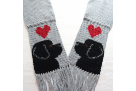 Bloodhound scarf. Gray crochet and knit scarf with rust color bloodhound dogs and red hearts. Scarf is handmade by us and a great gift for a big red dog lover. The bloodhound dog is one of our newer designs, created and made by us for our "Love My Dog" scarf series. We knit the scarf on a loom and then hand crochet the Bloodhounds and hearts into the ends of the scarf. Scarf is double thick, warm and has a soft drape. The hound dogs are crocheted with rust yarn and have walnut brown ears. The nose and eye are black. The hearts are crocheted with bright red yarn. The dogs are crocheted to face opposite directions when worn.