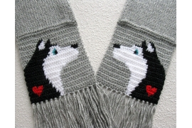 Husky dog scarf. This is a handmade, original knit and crochet scarf featuring black and white Siberian husky dogs and red hearts. The scarf is knit and crocheted with soft gray yarn and features a charcoal black and white husky on each end. The dogs are crocheted with charcoal black and white and have turquoise blue eyes. The hearts are crocheted with bright red. The dogs are crocheted to face opposite directions when worn.