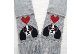 Jack Russell scarf. Handmade, grey knit scarf with Jack Russell Parsons terrier dogs. This is an original crochet design and one of our "love my dog" scarf series. This handmade scarf is loom knit (double thickness) with soft gray yarn and features a cute Jack Russell and red heart on each end of the scarf. The Jack Russell terriers are hand crocheted with white and light brown colored yarn. The Jack Russells have dark brown ears and a black eye and nose. The terriers are crocheted to face opposite directions when the scarf is worn. This scarf is thick and soft and has a soft flexible drape. All loose ends are sewn in, making this is a very well made scarf that will last for years. The last photograph shows the back side of the scarf.