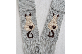 Knit Siamese cat scarf. This scarf is handmade featuring a siamese cat and a small heart on each end of the scarf. The scarf is loom knit with soft gray heather yarn and the knit length is double thick. I crochet the cat silhouettes and hearts into the ends of the scarf using a tapestry crochet technique. The cats are crocheted into the scarf with cream and chocolate brown. The small heart on the cats hip is crocheted with chocolate brown. This is a very well made scarf. All loose ends are sewn in and the last photograph shows the back side of the scarf.